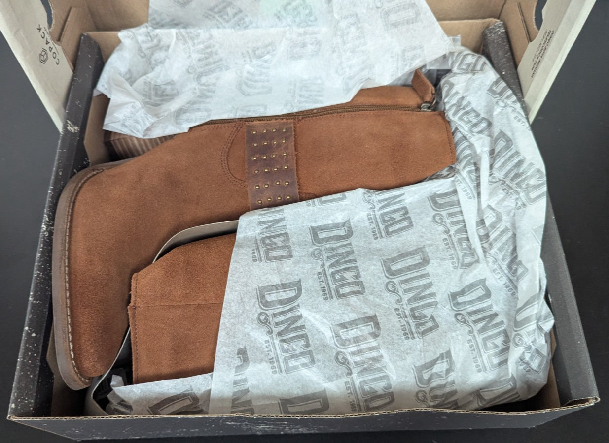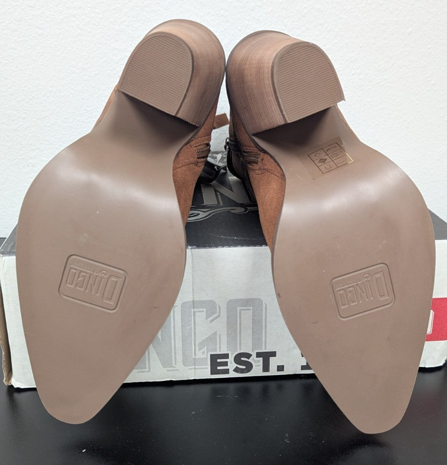 The Dingo Songbird Studded Snip Toe Zippered Cowboy Booties in women's brown casual boot style are a trendy and stylish footwear option. These ankle-height boots feature a lace-up closure and studded accents, giving them a unique and edgy look. With a high heel height and rubber outsole, these boots are perfect for adding a touch of vintage flair to any outdoor or casual outfit. Made of suede upper material and crafted in Mexico, these Dingo boots are a fashionable choice for those looking to make a statement with their footwear.