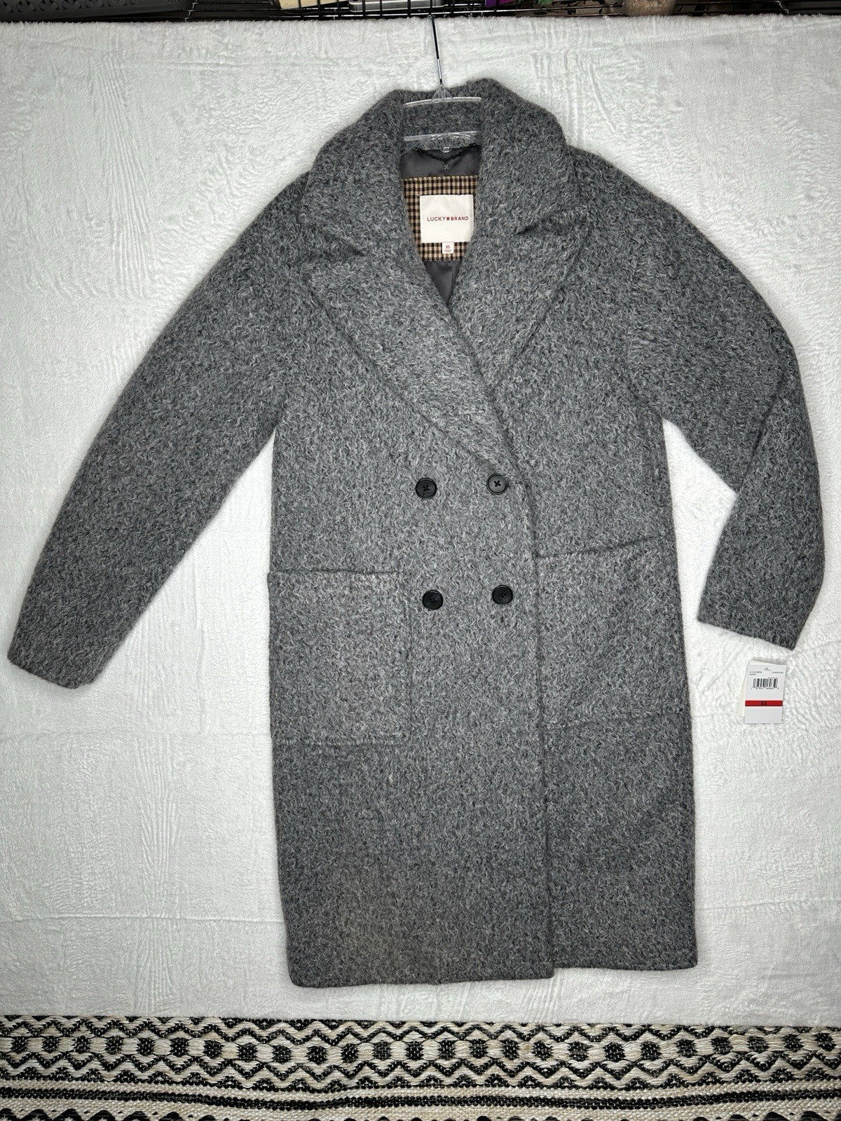 The Lucky Brand double-breasted wool blend peacoat is a stylish and cozy outerwear option for women in size XS. Made from a wool blend outer shell material and lined with a wool blend lining, this pea coat comes in a classic gray color. With its double-breasted design and regular fit, this coat from Lucky Brand combines both fashion and function to keep you warm and looking great in colder weather.