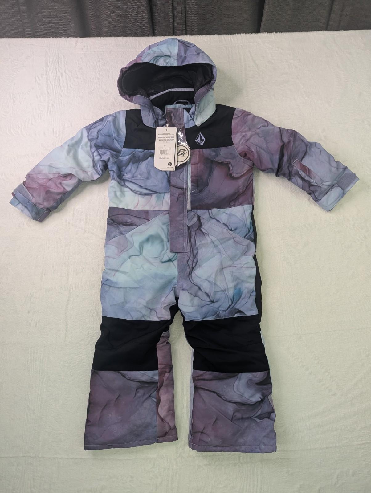 The product is a brand new 2024 Volcom toddler one-piece snowsuit in Glacier Ink, size 3T. This 5-piece unisex baby and toddler clothing item features a multicolor design, perfect for keeping your little one warm and stylish during cold weather or snow adventures. The durable materials and quality construction ensure both comfort and functionality for your child.